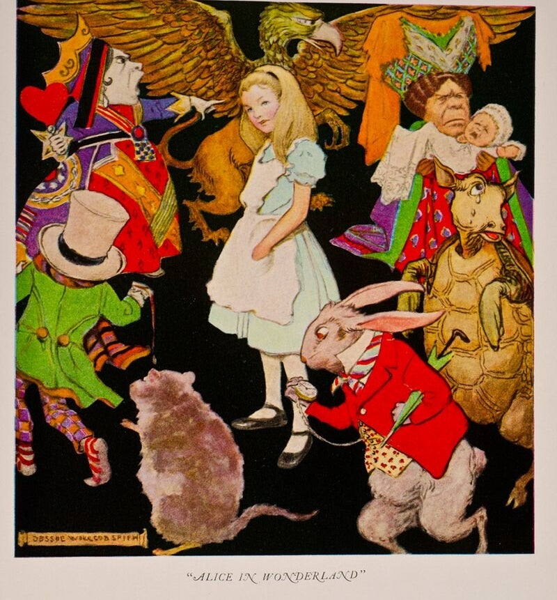 Een van de oudste, klassieke kinderboeken waar veel dieren in voorkomen is het boek Alice in Wonderland (1865) van Lewis Caroll. Zo is er een wit konijn met een horloge die altijd haast heeft, een kat die de hele tijd grijnst, een rups die een waterpijp rookt en een haas die theedrinkt. Alice komt via een konijnenhol na een lange val in deze bijzondere wereld van deze dieren terecht. Een wereld waarin in alle normen en waarden, wetten en regels uit onze gewone, dagelijkse realiteit van het leven op de hak worden genomen.