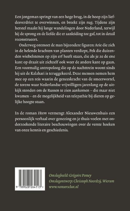 Deze mensen nemen hem mee op een reis waarin de geneeskracht van de smeerwortel, de torens waar Nederlandse vrijwilligers jarenlang op de uitkijk stonden om de Russen te zien aankomen – die maar niet kwamen – en de mogelijkheid van telepathie bij dieren op gelijke hoogte staan. In de roman Heem vermengt Alexander Nieuwenhuis een persoonlijk verhaal over genezing en je thuis voelen met onderzoekende literaire beschouwingen over de verste hoeken van onze kennis en geschiedenis.