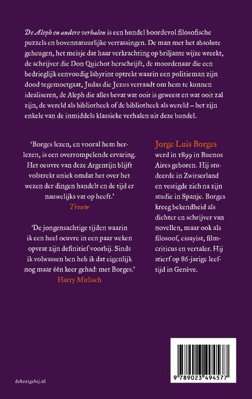 De Aleph en andere verhalen is een bundel boordevol filosofische puzzels en bovennatuurlijke verrassingen. De man met het absolute geheugen, het meisje dat haar verkrachting op briljante wijze wreekt, de schrijver die Don Quichot herschrijft, de moordenaar die een bedrieglijk eenvoudig labyrint optrekt waarin een politieman zijn dood tegemoet gaat, Judas die Jezus verraadt om hem te kunnen idealiseren, de Aleph die alles bevat wat ooit is geweest en wat ooit zal zijn, de wereld als bibliotheek of de bibliotheek als wereld – het zijn enkele van de inmiddels klassieke verhalen uit deze bundel.