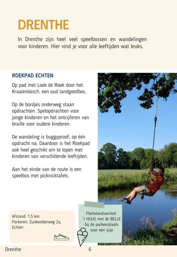 Dankzij dit boek weet je precies waar je moet zijn! De natuur ingaan was nog nooit zo leuk en makkelijk. Het boek is voorzien van veel foto’s en omvat omschrijvingen van zowel avontuurlijke speelplekken als korte routes voor jonge kinderen. Per route is aangegeven hoe lang deze is en wat de moeilijkheidsgraad is. Met dit boek krijg je nóg meer zin om op pad te gaan.
