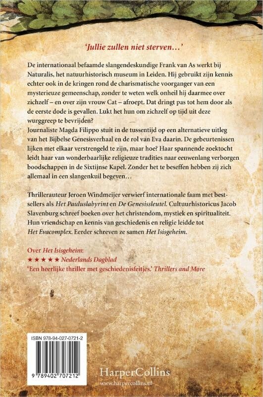 Journaliste Magda Filippo stuit in de tussentijd op een alternatieve uitleg van het Bijbelse Genesisverhaal en de rol van Eva daarin. De gebeurtenissen lijken met elkaar verstrengeld te zijn, maar hoe? Haar spannende zoektocht leidt haar van wonderbaarlijke religieuze tradities naar eeuwenlang verborgen boodschappen in de Sixtijnse kapel. Zonder het te beseffen hebben zij zich allemaal in een slangenkuil begeven…