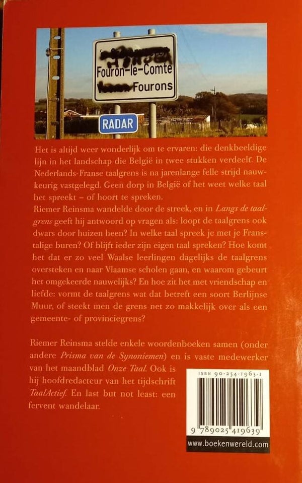 Riemer Reinsma wandelde door de streek, en ik Langs de taalgrens geeft hij antwoord op vragen als: loopt de taalgrens ook dwars door huizen heen? In welke taal spreek je met je Franstalige buren? Of blijft ieder zijn eigen taal spreken? Hoe komt het dat er zoveel Waalse leerlingen dagelijks de taalgrens oversteken en naar Vlaamse scholen gaan, en waarom gebeurt het omgekeerde nauwelijks? En hoe zit het met vriendschap en liefde: vormt de taalgrens wat dat betreft een Berlijnse muur of steekt men de grens net zo makkelijk over als een gemeente- of provinciegrens?